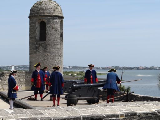 Vandaag hadden we een historisch dagje, want we gingen naar St. Augustine. Dit is de oudste door European gestichte stad van de Verenigde Staten. De rit er naartoe duurde maar zo’n 35 minuten, dus we waren er zo. We zetten de auto in de parkeergarage bij het Visitor Centre. Daar haalden we wat folders en vervolgens liepen we naar het Castillo de San Marcos, een oud fort. Toen we de kaartjes hadden gekocht en naar binnen liepen, werd ons geadviseerd naar het ‘gun deck’ te lopen, want daar werd net een demonstratie gegeven van het gebruik van de kanonnen. Dat wilden we wel eens zien. Er stonden enkele als Spaanse soldaten verklede mannen die met één van de kanonnon bezig waren. Op een gegeven moment riep een parkranger ‘ears closed’. Daarna kwam er een luide knal en werd een schot gegeven. Dat was leuk om mee te maken.