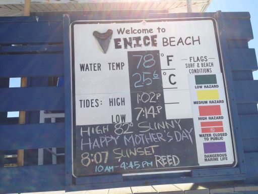 Over vandaag kunnen we kort zijn: we hebben veel gerelaxed aan het strand van Venice Beach en ons eigen zwembad. Bij Venice hadden de strandwachten eraan gedacht dat het moederdag was. Op het bord met de temperatuur van het water en de lucht, de tijden van hoog- en laagtij en de sunset was ook ‘Happy Mother’s day’ geschreven. Heel attent. Wij hebben onze moeders vanmorgen natuurlijk ook nog even gebeld. Aan het einde van de middag zijn we nog even naar de Walmart gereden voor een zonnebril, want de zon schijnt hier zo fel dat een van onze zonnebrillen het spontaan begaf. Verder is het weer hier fantastisch en ook de komende week belooft weer erg mooi te worden, dus we zitten hier voorlopig nog goed!